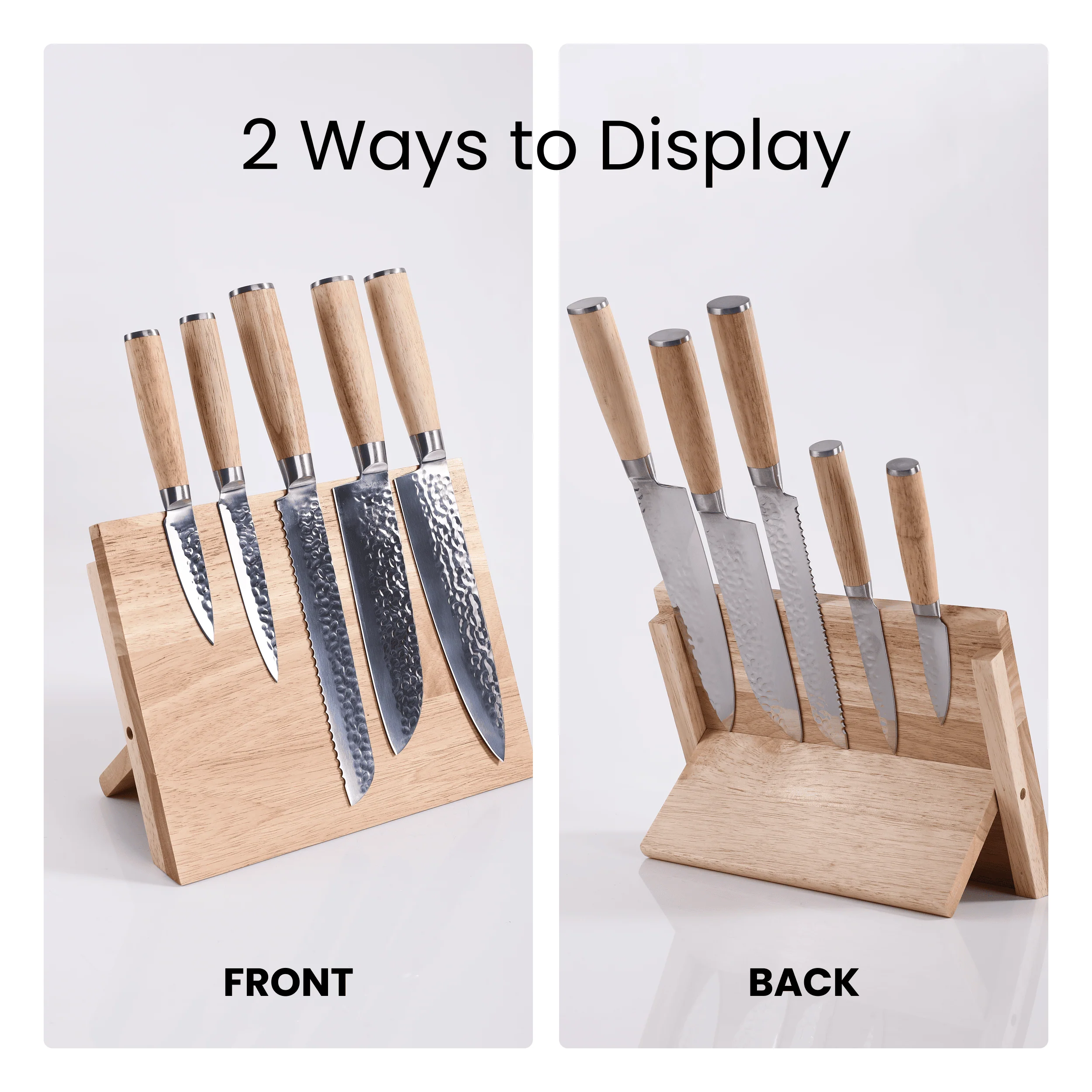The rubberwood block is fully magnetic on both the front and back, allowing you to display and store knives securely on either side. A foldable rear leg lets you collapse and store the stand flat when not in use.