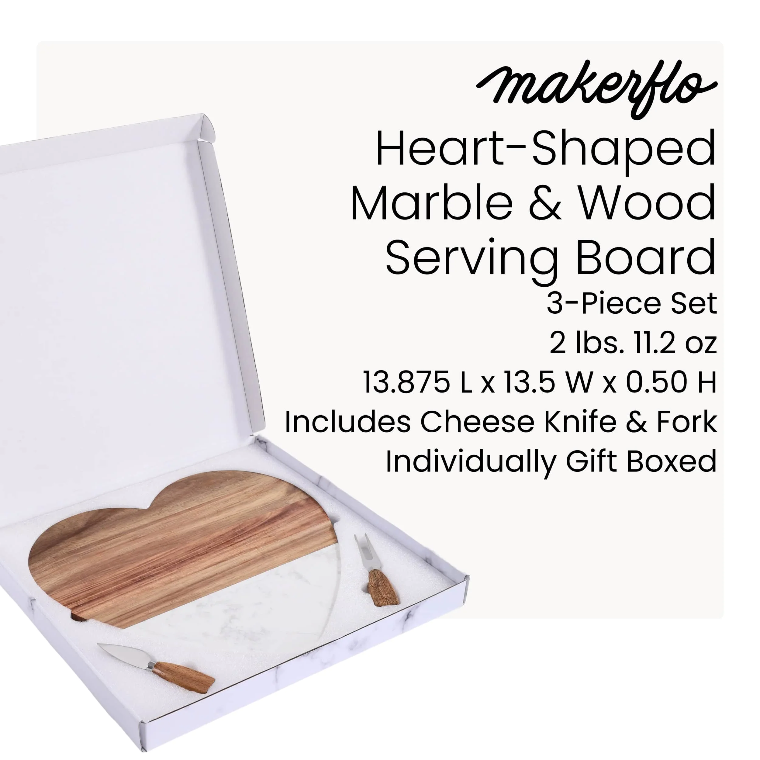 - Three piece set includes board, cheese fork & knife